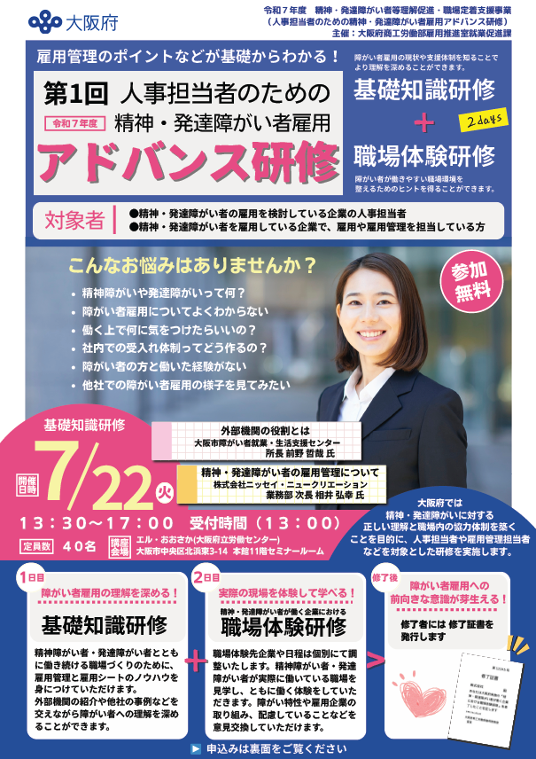 大阪府商工労働部雇用推進室就業促進課が主催する「第1回人事担当者のための精神・発達障がい者雇用 アドバンス研修」において、有限会社奥進システムで職場体験研修を実施しました。