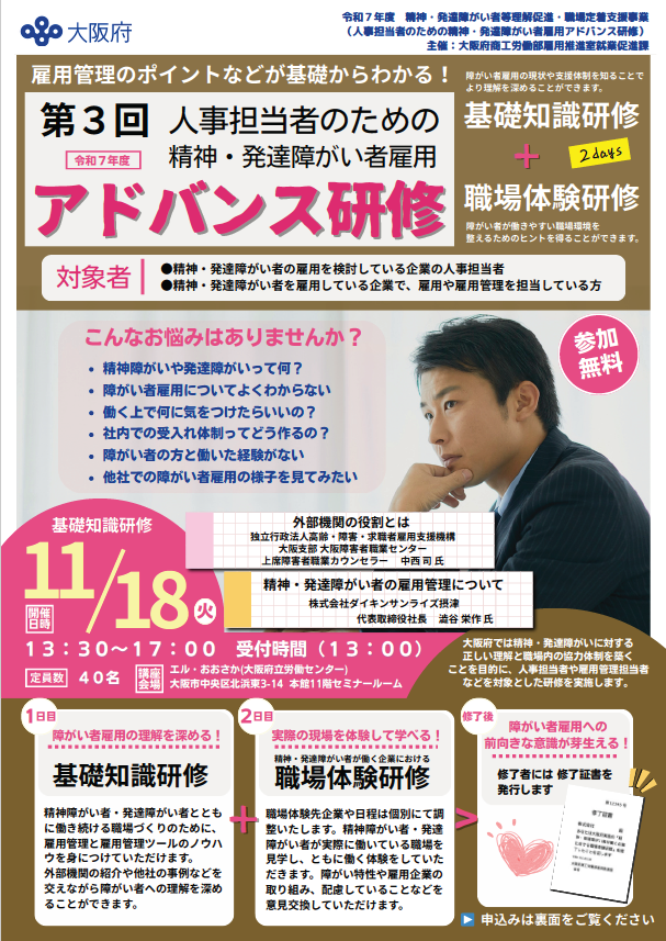 大阪府商工労働部雇用推進室就業促進課が主催する「第3回人事担当者のための精神・発達障がい者雇用 アドバンス研修」において、有限会社奥進システムで職場体験研修を実施しました。